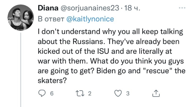 «Я не понимаю, почему вы продолжаете говорить о русских, — написала Diana. — Они уже были выгнаны из Международного союза конькобежцев (ISU) и, по сути, воюют с этой организацией. Что, по-вашему, ISU может сделать с русскими? Просить: «Байден, приди и спаси фигуристов»? К тому же, если ISU забанили всех россиян, то что они могут теперь сделать с Этери? Это как если бы мой начальник меня уволил, а потом пошел и написал жалобу на меня».