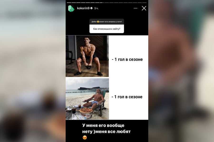 Кокорина спросили в социальной сети о его отношении к хейту, и в ответ футболист написал: «У меня его вообще нет. Меня все любят».