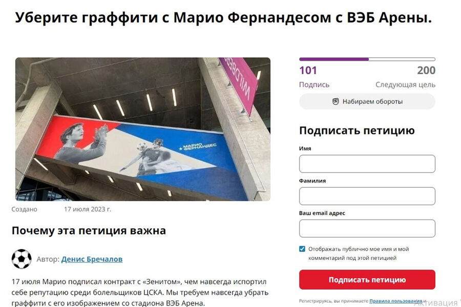 «17 июля Марио подписал контракт с «Зенитом», чем навсегда испортил себе репутацию среди болельщиков ЦСКА. Мы требуем навсегда убрать граффити с его изображением со стадиона «ВЭБ Арена», — написал создатель петиции, которая собрала за два часа более 300 подписей.