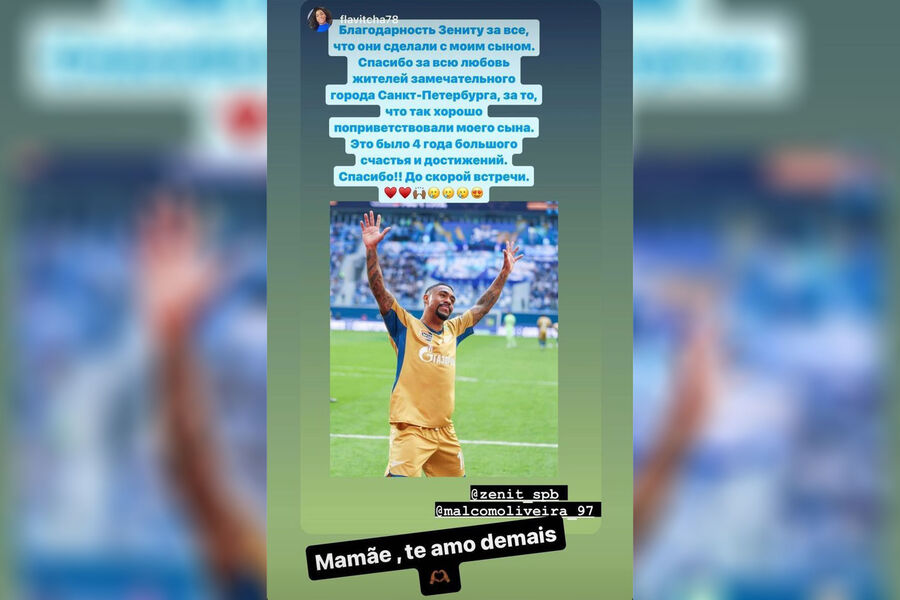 Флавиа де Оливейра, мать бразильского нападающего Малкома, на русском языке написала благодарственное письмо российскому «Зениту» после перехода игрока в саудовский «Аль-Хиляль». Обращение она опубликовала в Instagram (владелец компания Meta признана в России экстремистской и запрещена).