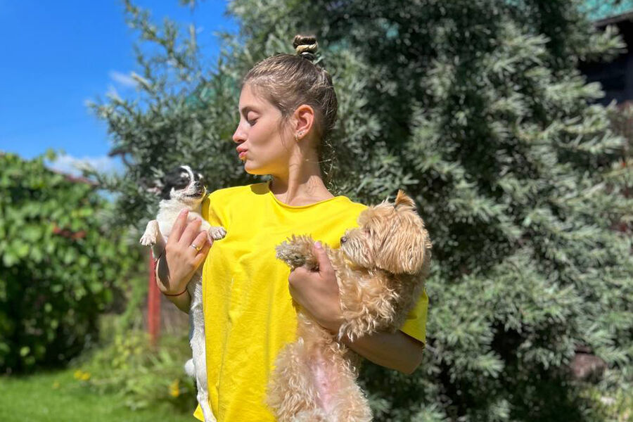 Спортсменка предстала перед своими подписчиками в желтом платье с двумя собаками в руках.