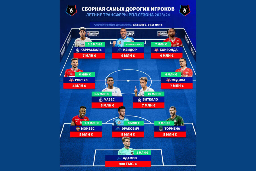 Интернет-портал Transfermarkt подвел итоги летнего трансферного окна для клубов Российской Премьер-Лиги (РПЛ), опубликовав состав сборной из самых дорогих игроков, переехавших в Россию в межсезонье.