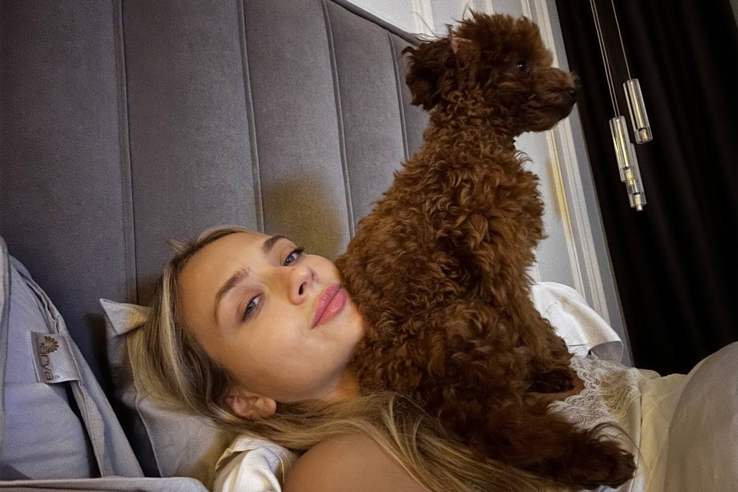 Российская фигуристка Виктория Синицина в своем Telegram-канале опубликовала фотографию из кровати, на которой она позирует вместе со своим псом, расположившимся прямо на хозяйке.