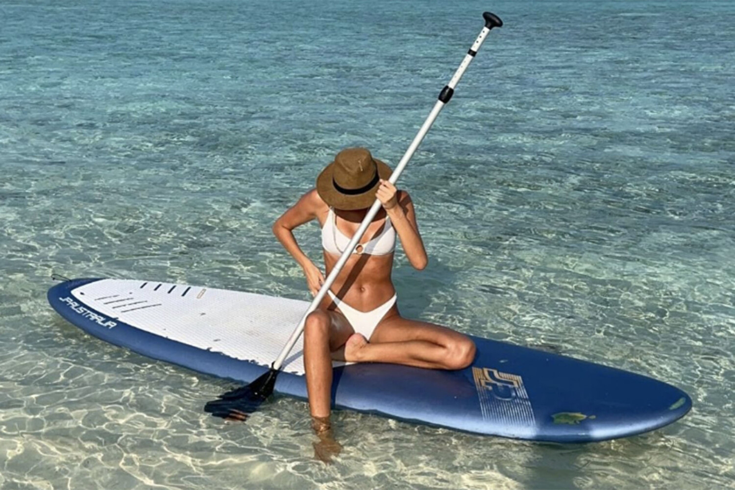 Чемпионка мира по художественной гимнастике Евгения Леванова в своих социальных сетях поделилась снимком с отдыха. Девушка, сидя на сапе, позирует в белом бикини и шляпе.