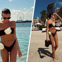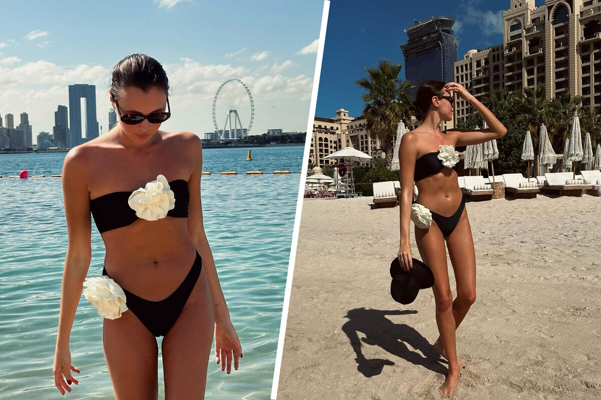 Спортсменка предстала перед подписчиками в новом купальнике на фоне песчаного пляжа.