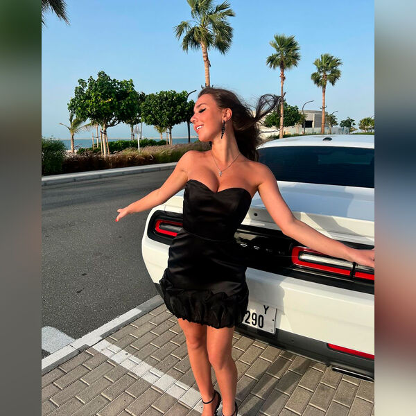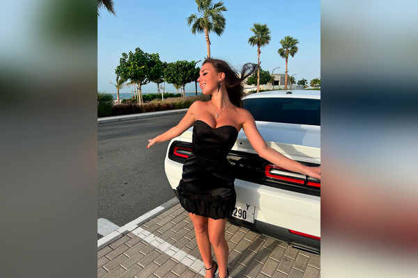 21-летняя спортсменка позирует в коротком черном платье на фоне дорогого автомобиля.