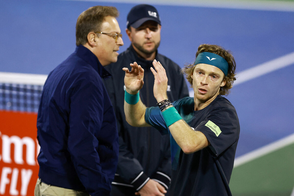 Супервайзер принял решение о немедленной дисквалификации Рублева. Теннисист объяснил, что не употреблял матерных выражений, однако супервайзер решил довериться переводу русскоязычного арбитра.