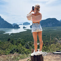На одном из кадров спортсменка запечатлена сзади. Она одета в короткие джинсовые шорты, а также сетчатую кофту, под которой находится розовый лиф.
