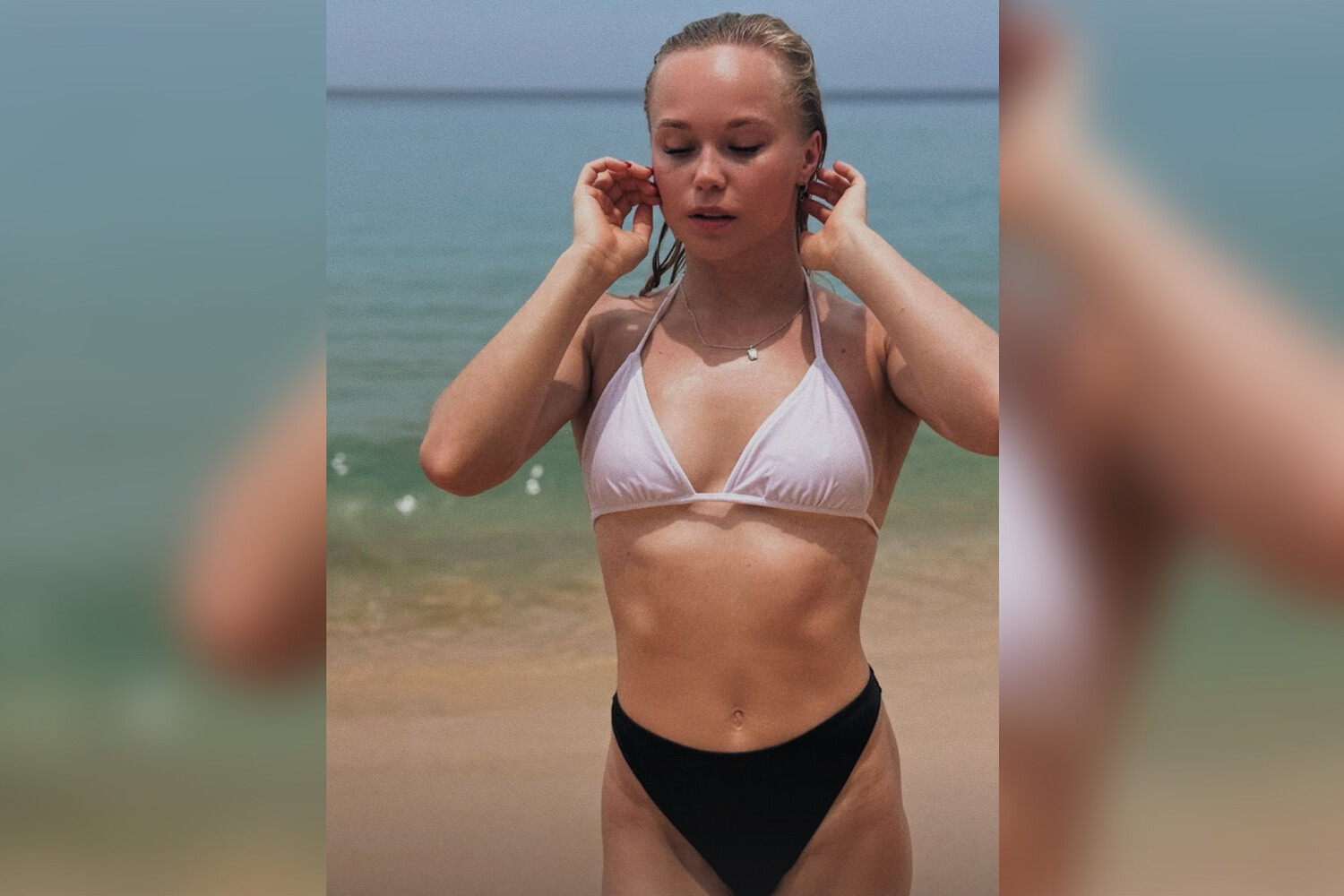 На снимке спортсменка позирует на пляже в раздельном купальнике.
