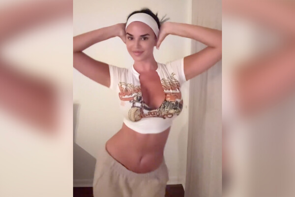 Модель танцует в кроп-топе с глубоким декольте, который обнажает часть ее груди.
