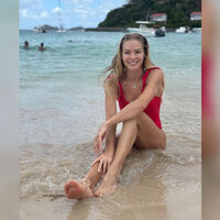 На снимке спортсменка позирует на пляже рядом с водой. На ней надет ярко-красный слитный купальник.