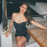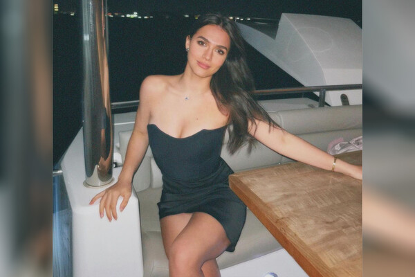 Она позирует сидя в черном мини-платье, которое обнажает плечи и часть груди.