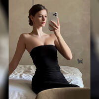 Она позирует сидя в черном мини-платье, которое открывает плечи.