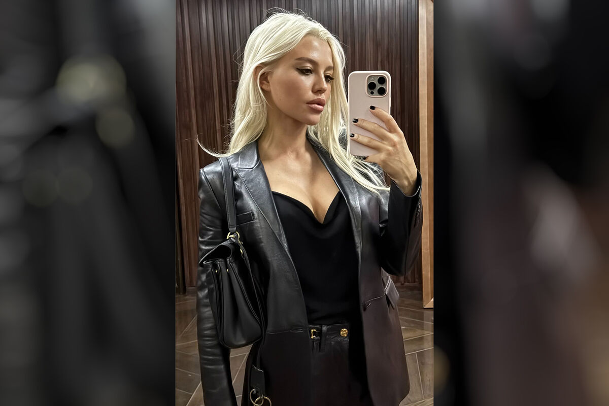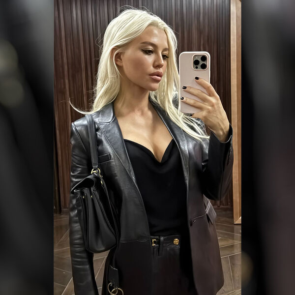 Валитова позирует в пиджаке и блузке с глубоким вырезом, который обнажает часть груди.