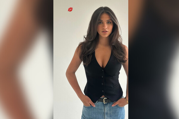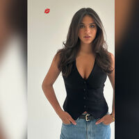На кадре спортсменка позирует в обтягивающей блузе без рукавов с глубоким декольте, которое обнажает часть груди.