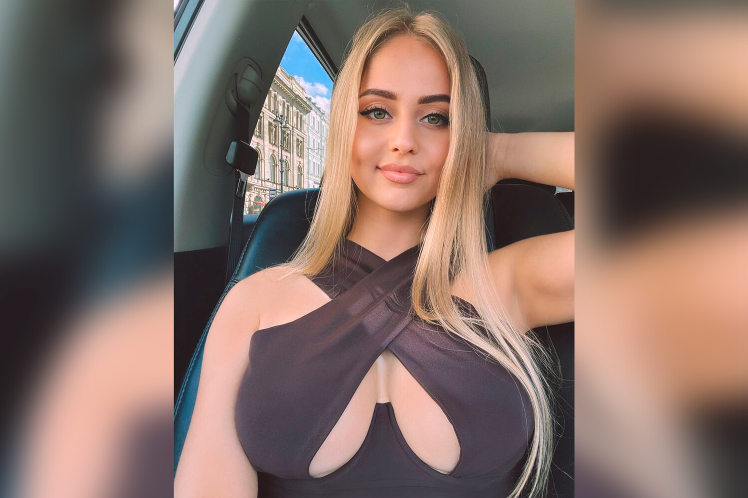 На снимке девушка позирует в платье, которое подчеркивает ее грудь.