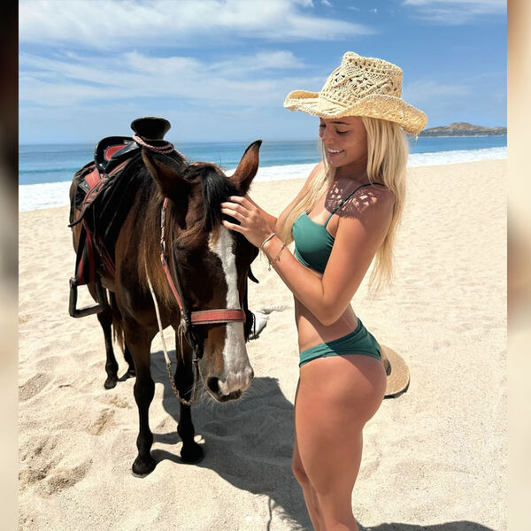 Спортсменка выложила снимок, на котором она позирует для подписчиков, находясь рядом с лошадью на песчаном берегу одного из пляжей. Данн предстала в ярком образе, надев вместе с купальником белую шляпу.