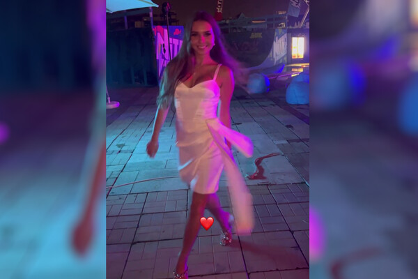 На кадрах спортсменка позирует в белом атласном платье с глубоким декольте, которое обнажает часть груди.