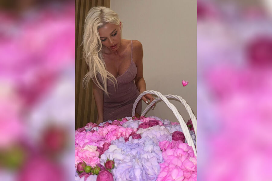 На кадре Валитова позирует рядом с большим букетом цветов. На ней надето розовое блестящее платье с декольте, который оголяет часть груди.