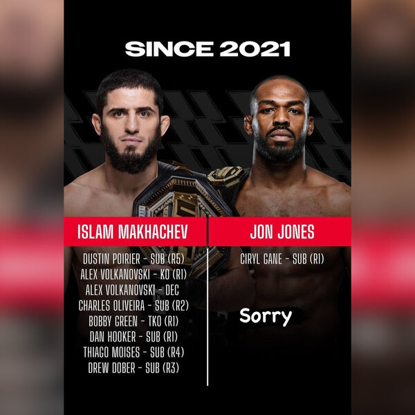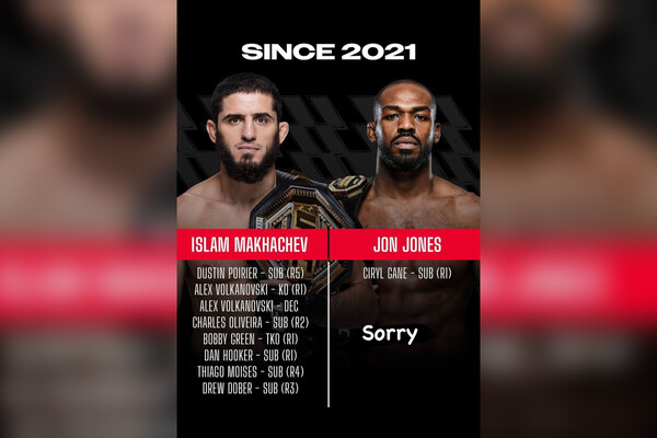 Махачев опубликовал сводную таблицу, в котором сравнил свои достижения с успехами Джонса, начиная с 2021 года. Россиянин одержал восемь побед, а американец выиграли лишь один поединок.