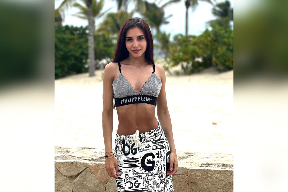 На кадре спортсменка позирует в верхе от купальника, на бедрах — юбка.