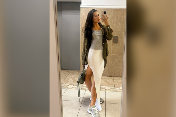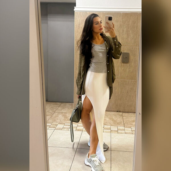 Спортсменка выложила фотографию в зеркале в полный рост, показав подписчикам белую юбку с необычным разрезом в районе бедер.