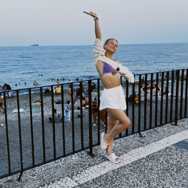 Спортсменка предстала перед подписчиками на берегу моря в сиреневом купальнике и белых шортах.