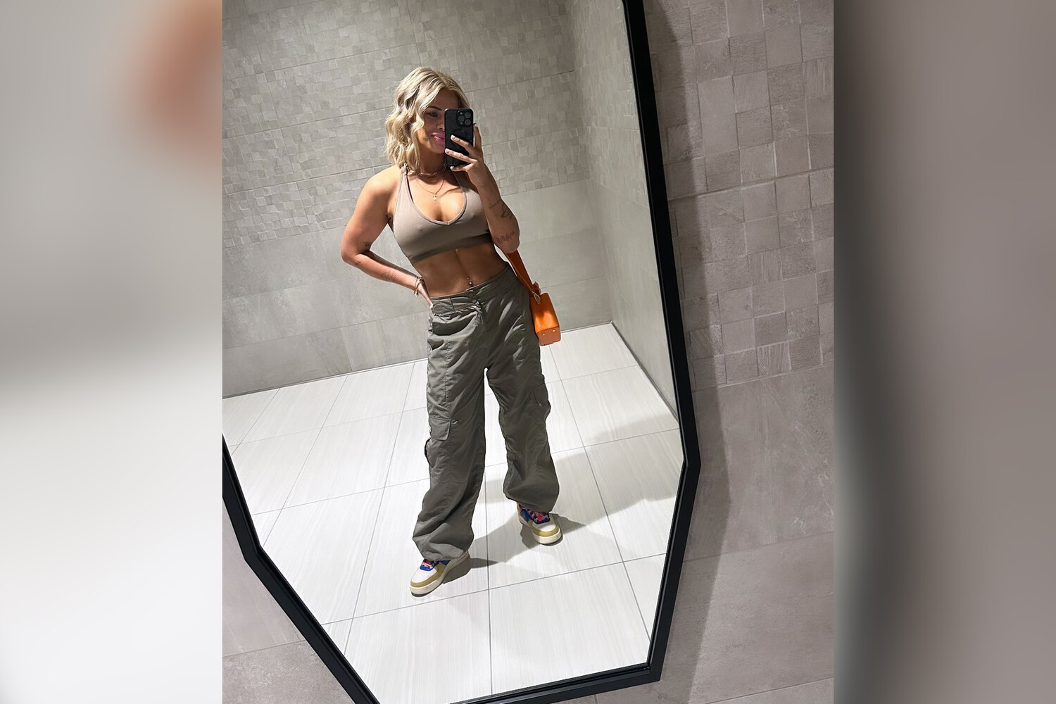 Спортсменка опубликовала фото в топе, облегающем грудь, и широких брюках.