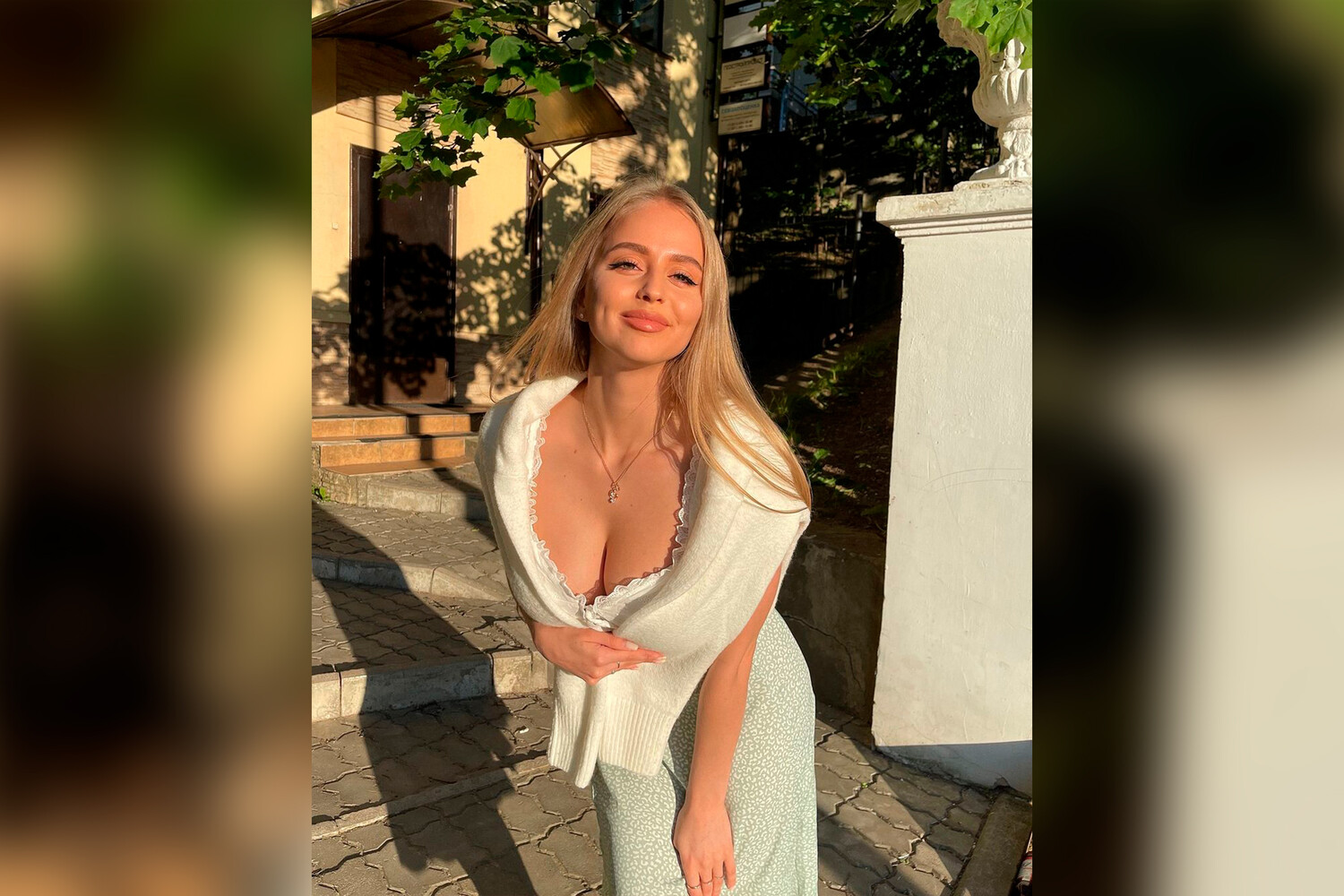 На снимке девушка позирует в белом платье с декольте.