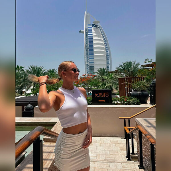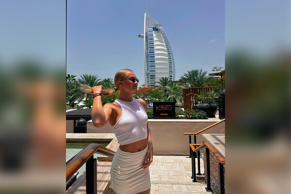 Спортсменка предстала перед подписчиками в белом топе и юбке.