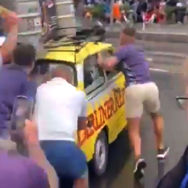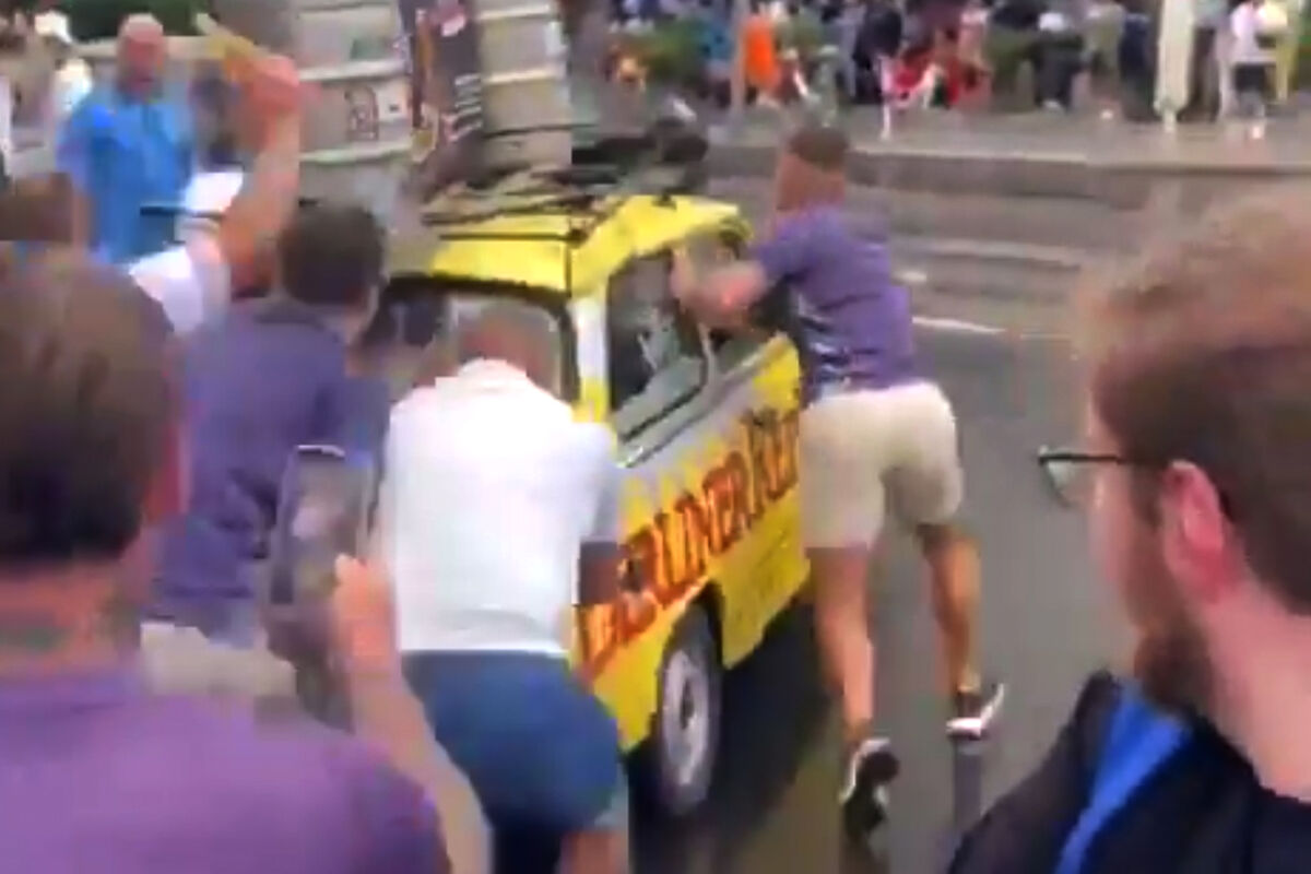 Пьяные фанаты угнали желтый ретроавтомобиль «Трабант», который стоял рядом с местным пабом, и вытолкнули его на проезжую часть, где в этот момент ехала другая машина. В результате произошло столкновение. Место аварии оцепила полиция.
