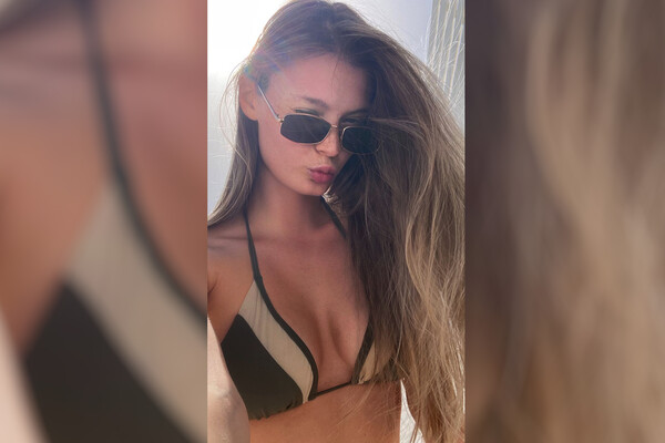 Спортсменка снимает себя сама и позирует в купальнике, который обнажает часть груди.