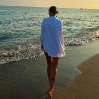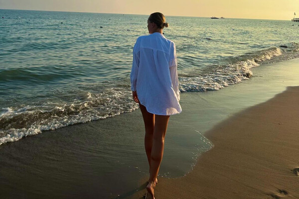 Спортсменка показала подписчикам фрагмент вечерней прогулки на пляже. Девушка вышла на нее в длинной рубашке и прошлась босиком по песку.