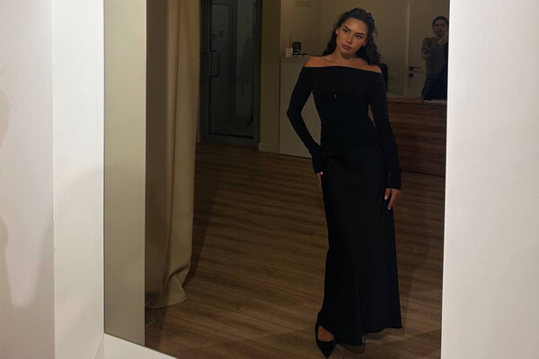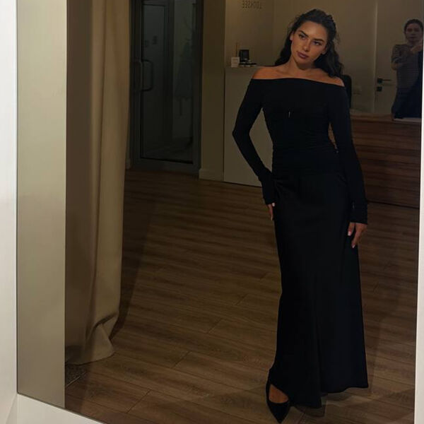 Спортсменка выложила фото в облегающем черном платье с вырезом в районе плеч.