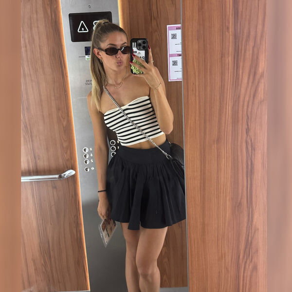 Спортсменка позирует на снимке в черной мини-юбке.