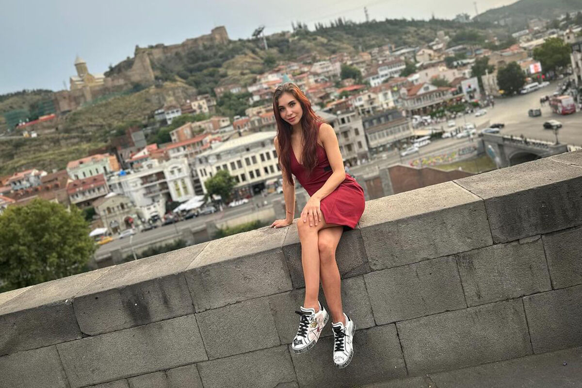 На ней спортсменка позирует в красном платье на фоне живописного пейзажа в Грузии.