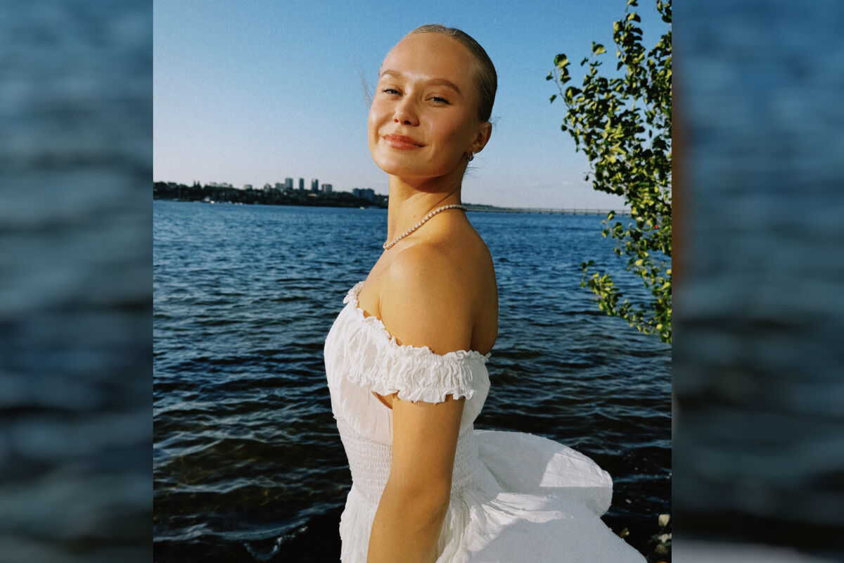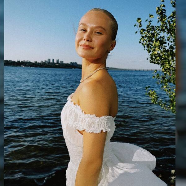 На кадрах спортсменка позирует в белом платье.