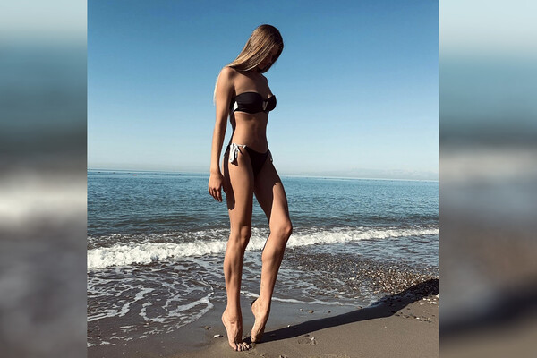 Спортсменка опубликовала кадры на песчаном берегу одного из пляжей, встав на высокий полупалец и повернувшись к объективу правым бедром.