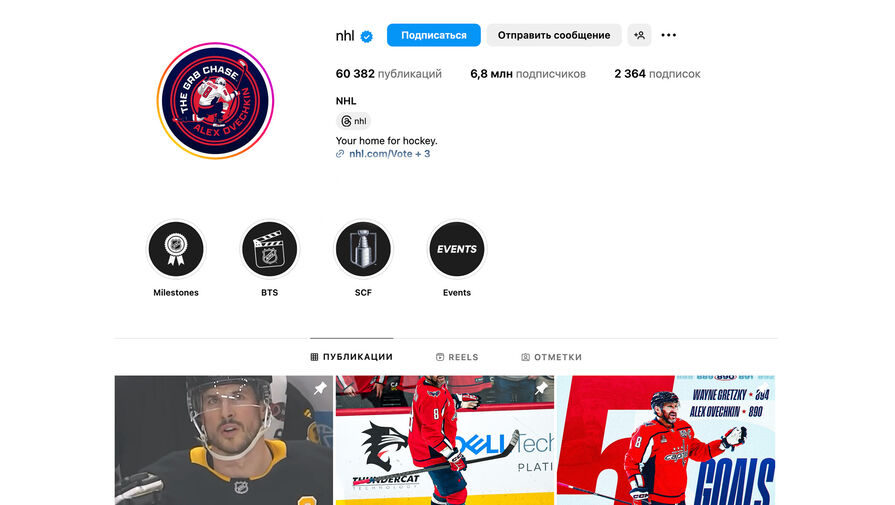 Национальная хоккейная лига (НХЛ) изменила аватарки в своих социальных сетях, посвятив их погоне российского нападающего «Вашингтон Кэпиталз» Александра Овечкина за рекордом канадца Уэйна Гретцки.
