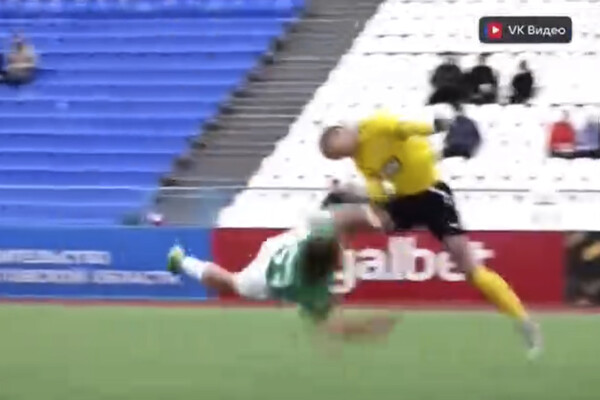 Во время футбольного матча Первой лиги между саратовским «Соколом» и московской «Родиной» головами столкнулись футболист саратовцев Никита Карабашев и игрок «Родины» Георгий Юдинцев.