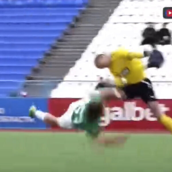 Голкипер москвичей хотел сыграть головой вне штрафной площади. На мяч также шел футболист «Сокола». Игроки не видели друг друга и столкнулись.