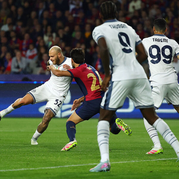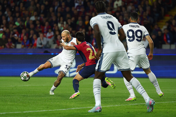 Первый матч между «Барселоной» и «Интером» завершился со счетом 3:3. Ответную встречу миланцы выиграли 4:3, при этом до 93-й минуты сине-гранатовые вели 3:2. На голы игроков итальянской команды Лаутаро Мартинеса и Хакана Чалханоглу каталонцы ответили точными ударами Эрика Гарсии, Дани Ольмо и Рафиньи. Однако уже в компенсированное время Франческо Ачерби сравнял счет, а в первом дополнительном тайме Давиде Фраттези забил мяч, который принес «нерадзурри» победу. В финале «Интер» сыграет с французским «ПСЖ», выбившим из борьбы «Арсенал».