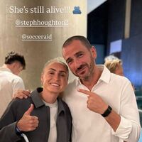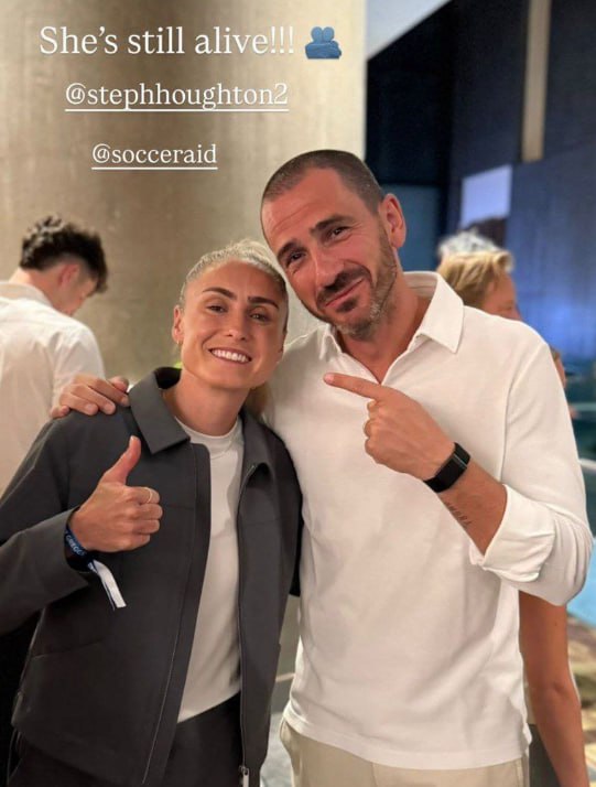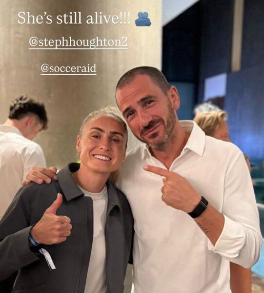Бывший футболист сборной Италии Леонардо Бонуччи пошутил над футболисткой Стефани Хоутон, против которой совершил жесткий подкат во время благотворительного матча, снеся ее с ног.