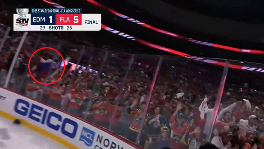 Болельщики принесли на трибуны и растянули российский флаг по ходу шестого матча финальной серии Кубка Стэнли между «Флоридой Пантерз» и «Эдмонтон Ойлерз, передает «Чемпионат».