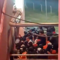 Матч был остановлен. Его обещали возобновить, когда фанаты «Универсидадада» добровольно покинут стадион. Болельщики чилийцев стали покидать арену. Аргентинцы напали на чилийцев, когда их оставалось совсем немного на трибунах. Некоторые из пострадавших получили ножевые ранения, один из болельщиков упал с высоты.