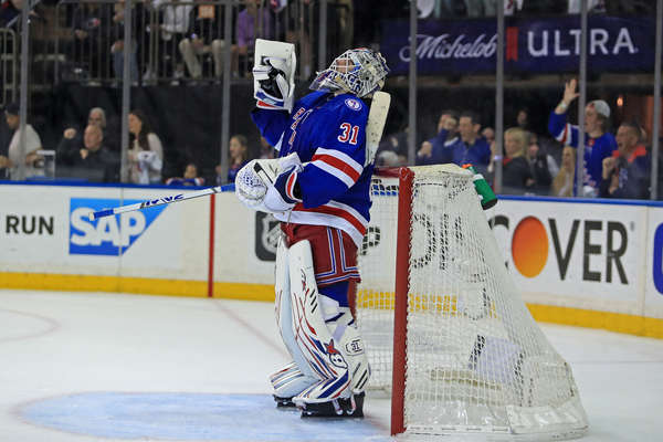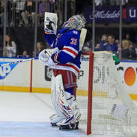 Вратарь «Рейнджерс» Игорь Шестеркин сломал клюшку после поражения в матче Национальной хоккейной лиги (НХЛ) против «Анахайма».