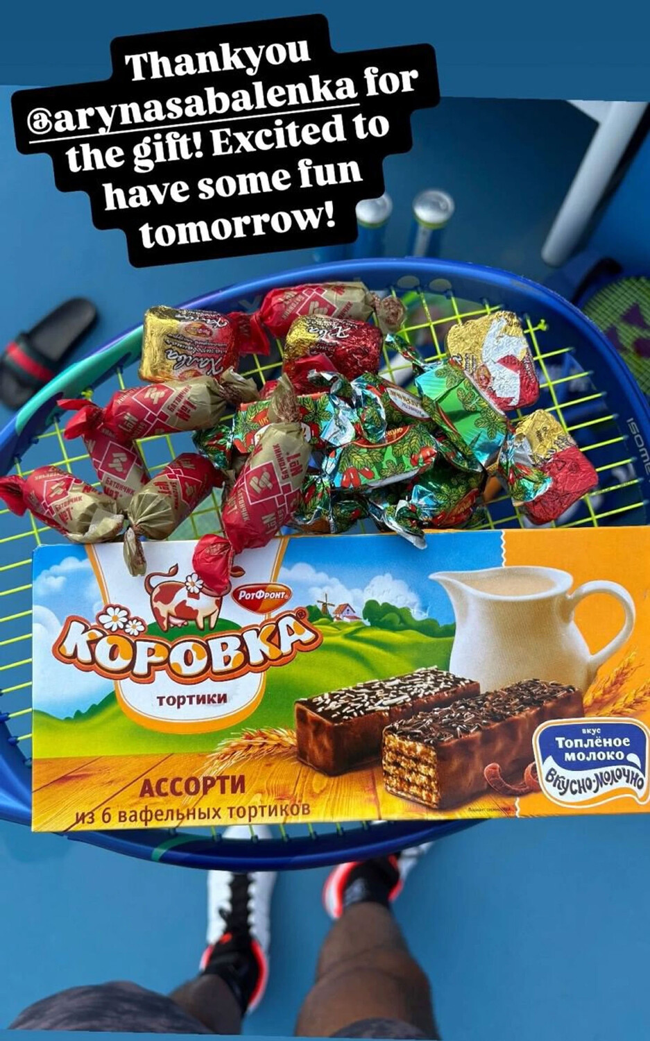 Белорусская теннисистка Арина Соболенко, которая является первой ракеткой мира, подарила австралийскому теннисисту Нику Кирьосу российские сладости. Об этом он рассказал в своем Instagram (владелец компания Meta признана в России экстремистской и запрещена).