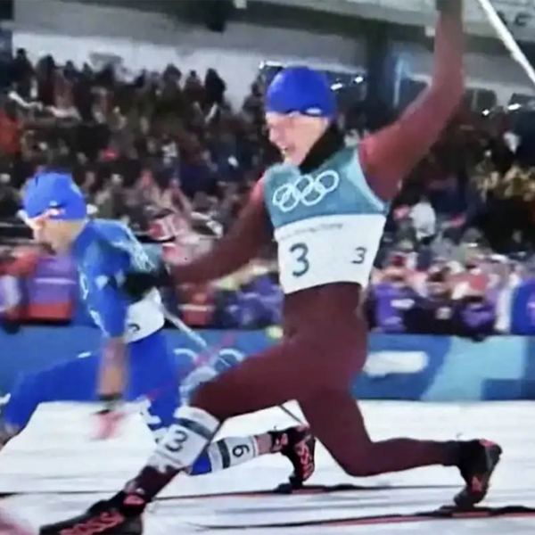В видеоролике МОК показан фрагмент финиша Большунова в спринте классическим стилем на Олимпийских играх в Пхенчхане. Тогда российский спортсмен выиграл бронзовую награду.