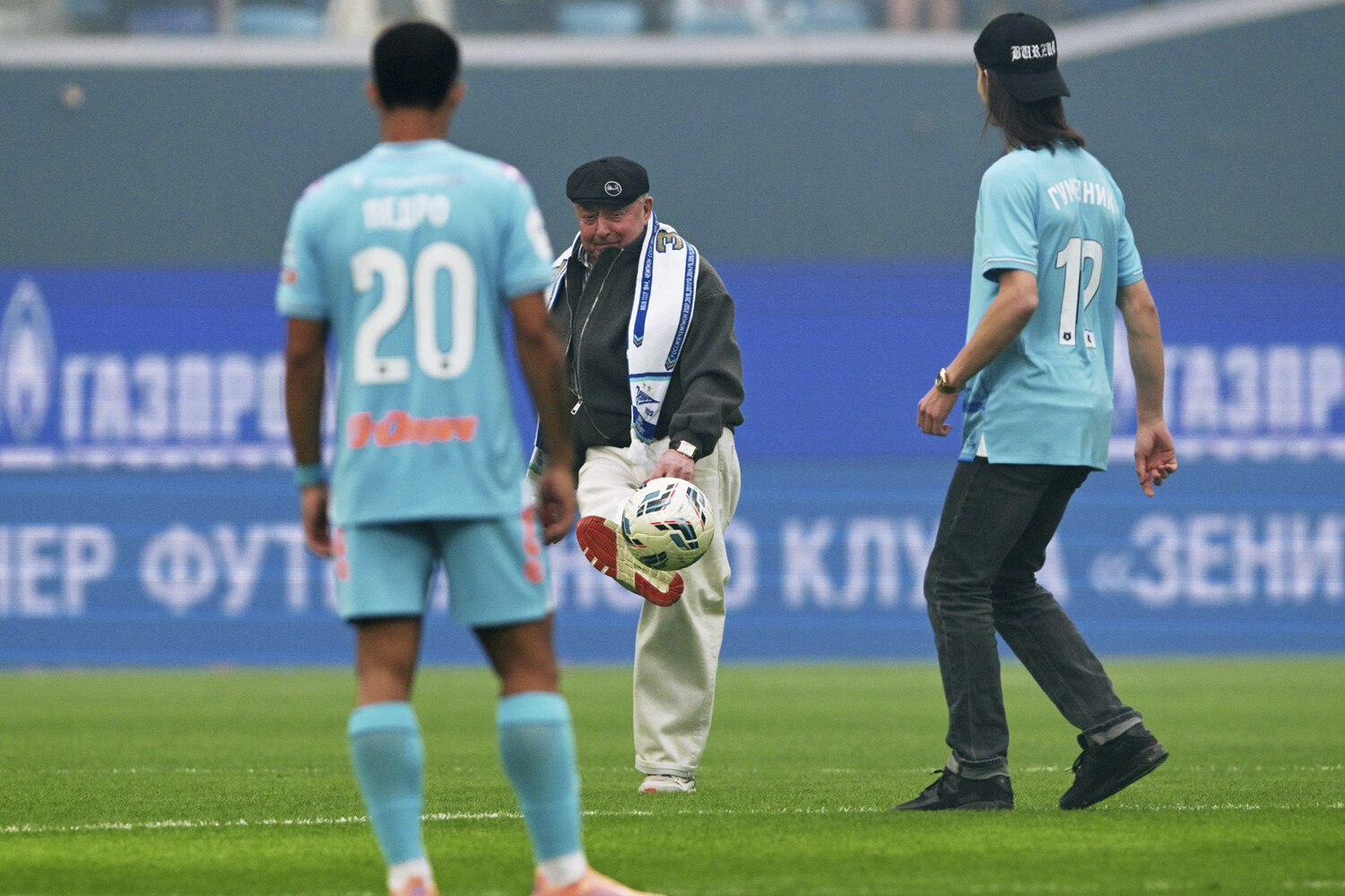 Российский фигурист Петр Гуменник и известный тренер Алексей Мишин нанесли символические удары по мячу перед матчем 21-го тура Российской премьер-лиги (РПЛ) между петербургским «Зенитом» и московским «Спартаком».