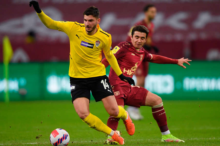 Мирзов ушел от Зотова и Кучаева, сместился на угол штрафной, но не ударил, а решил отдать передачу. Она не нашла адресата.
